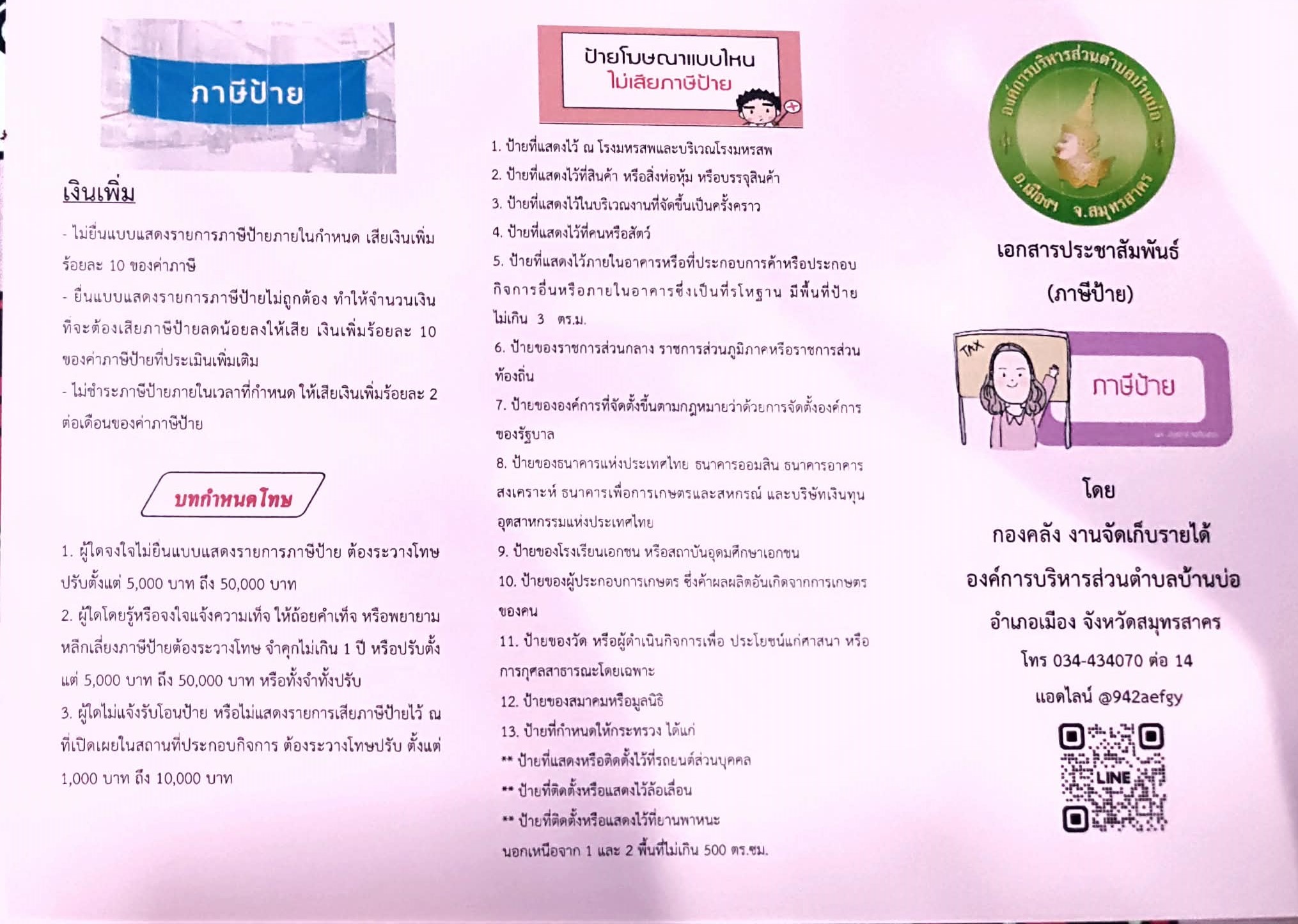 องค์การบริหารส่วนตำบลบ้านบ่อ อำเภอเมืองฯ จังหวัดสมุทรสาคร โทร. 0-3443-4070
