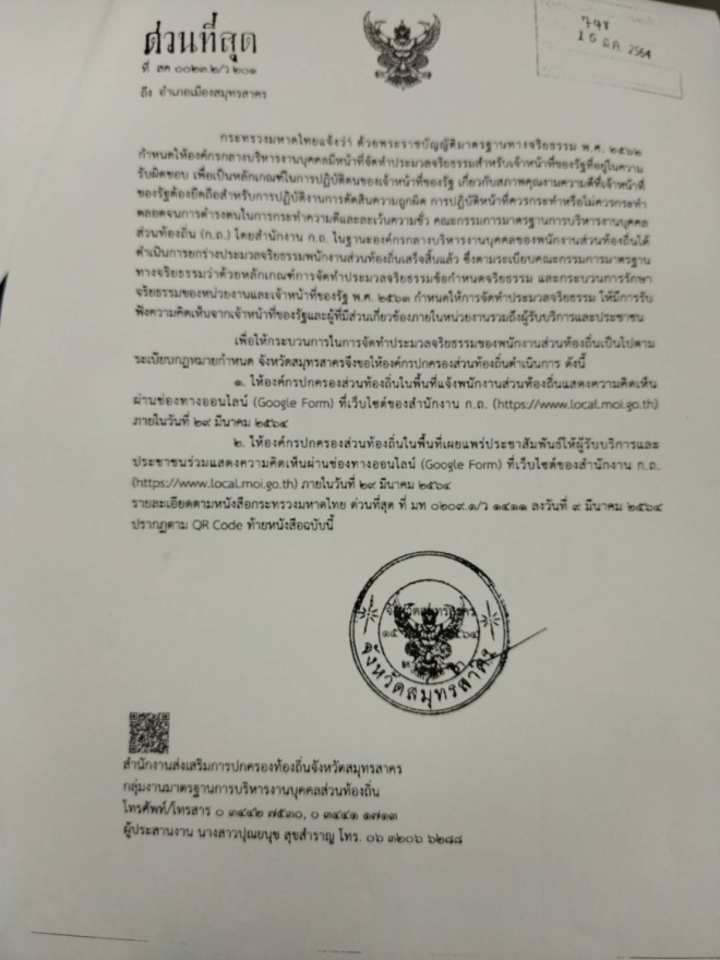 องค์การบริหารส่วนตำบลบ้านบ่อ อำเภอเมืองฯ จังหวัดสมุทรสาคร โทร. 0-3443-4070