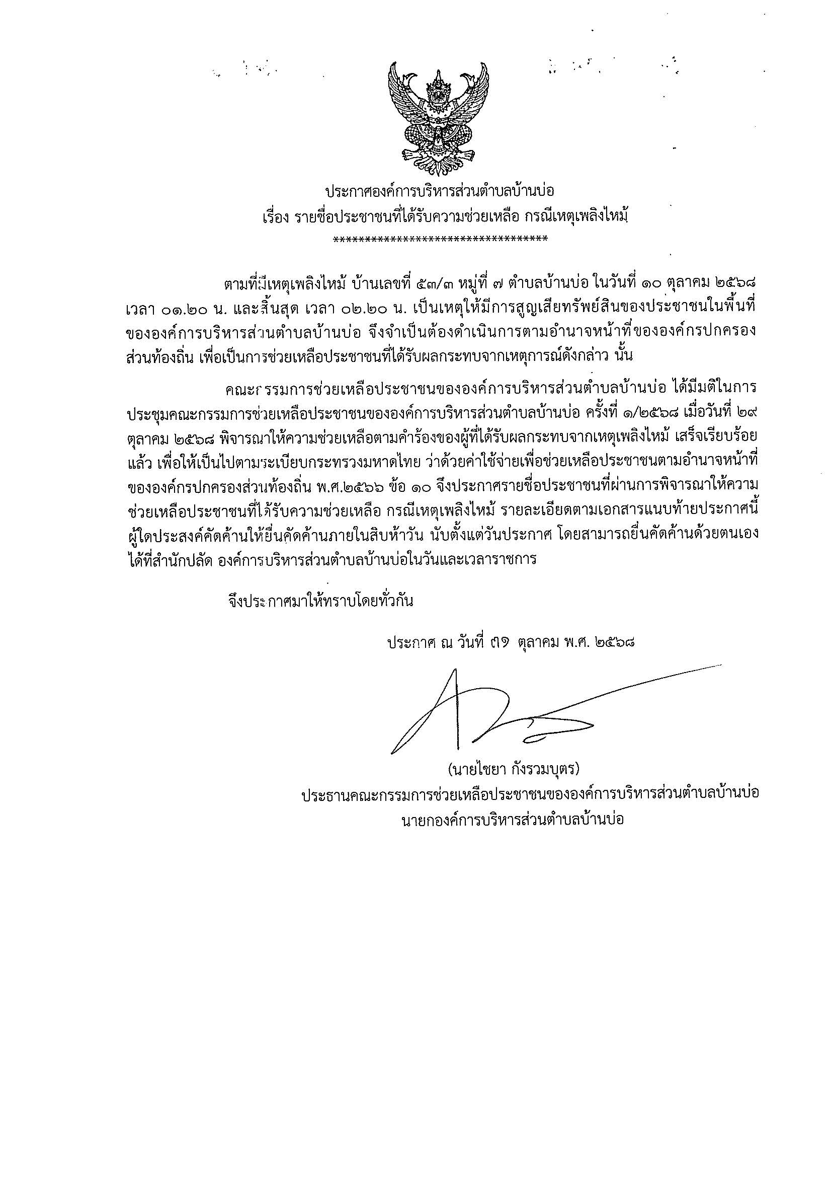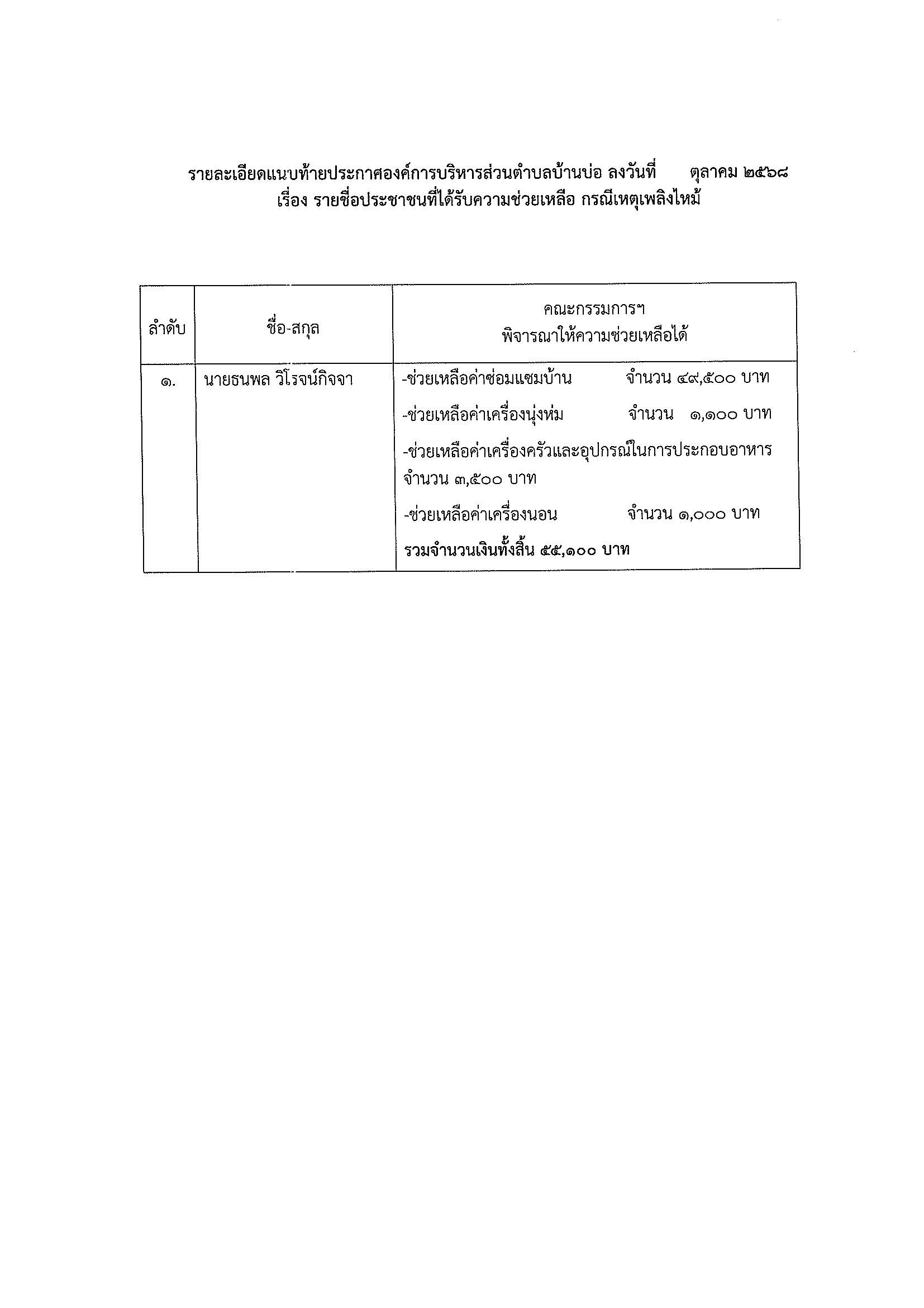 เรื่อง รายชื่อประชาชนที่ได้รับความช่วยเหลือ กรณีเหตุเพลิงไหม้